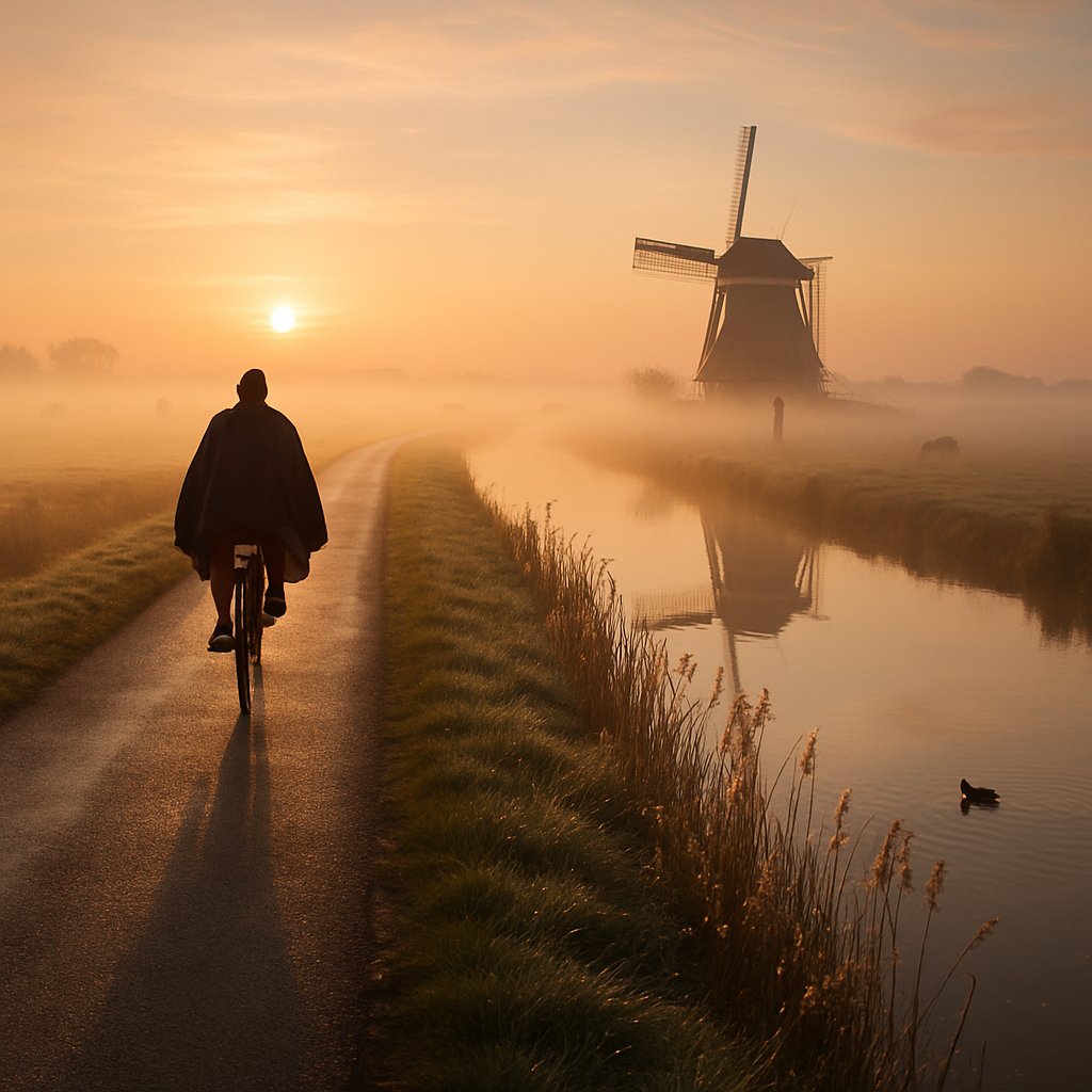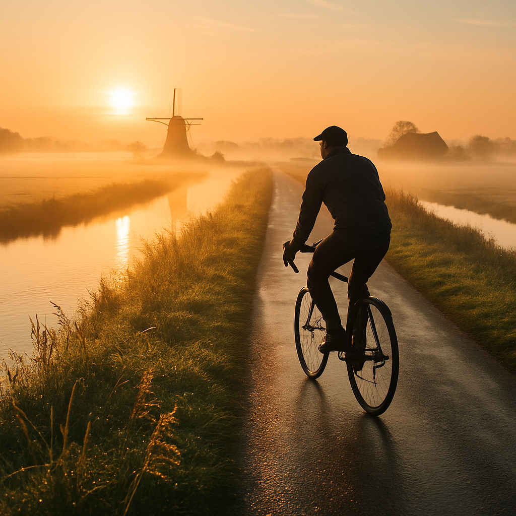 Nog vóór de stad ontwaakt, glij ik de polder in. De lucht hangt laag, een sluier van zilver die sloten…