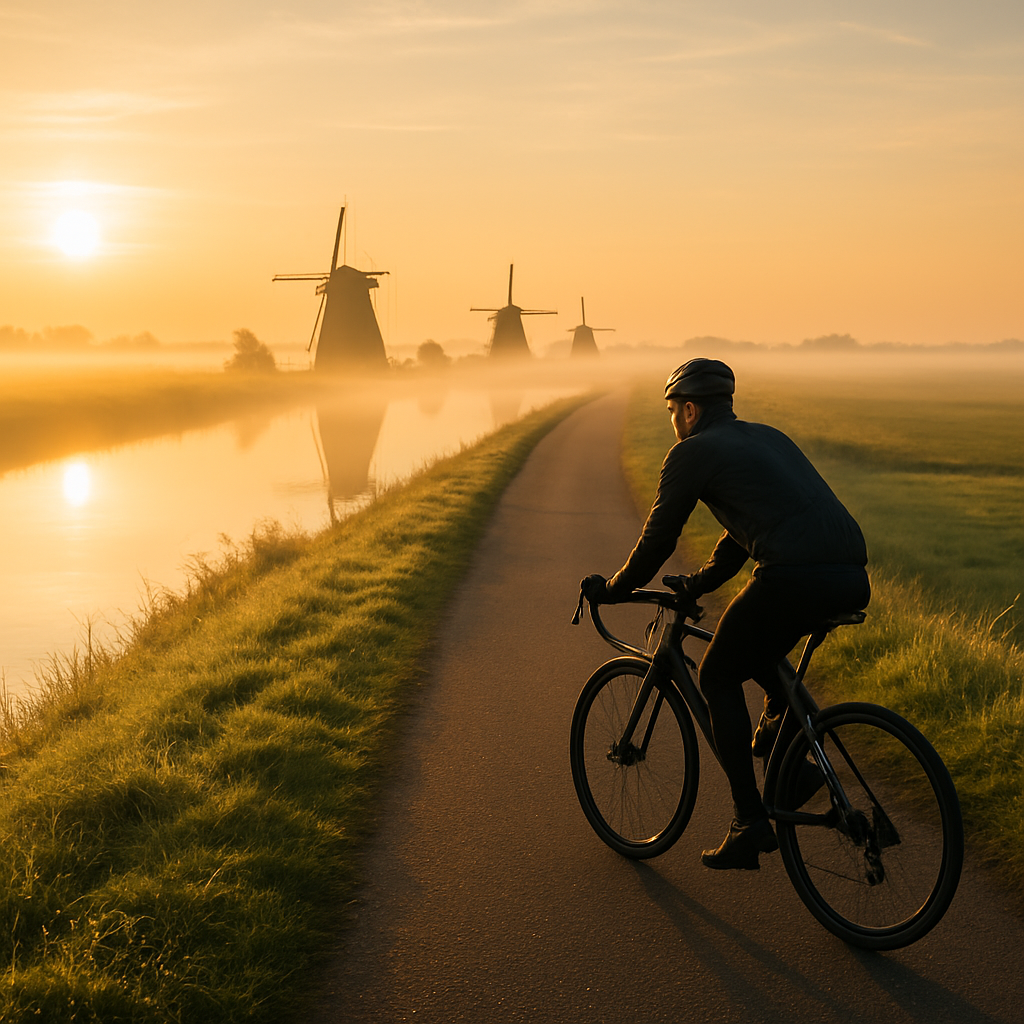 Nog vóór de stad ontwaakt, glij ik de polder in. De lucht hangt laag, een sluier van zilver die sloten…