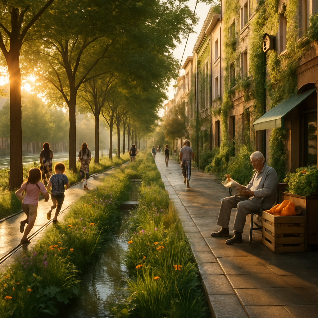 Er is niets luidruchtigs aan de manier waarop het ontwerp zich ontvouwt; het fluistert. Rietkragen buigen voor het water, jonge berken buigen voor het licht. Kinderen zigzaggen over de paden, hun lachen ketsend tegen de bakstenen kades. De houten leuningen zijn glad, warm aan de vingers, en elk bankje staat zo dat je de rivier kunt horen denken. De skyline kijkt mee, maar domineert niet. Wat ooit een grens was, wordt hier een hechting: stad en stroom die elkaar opnieuw leren vasthouden.