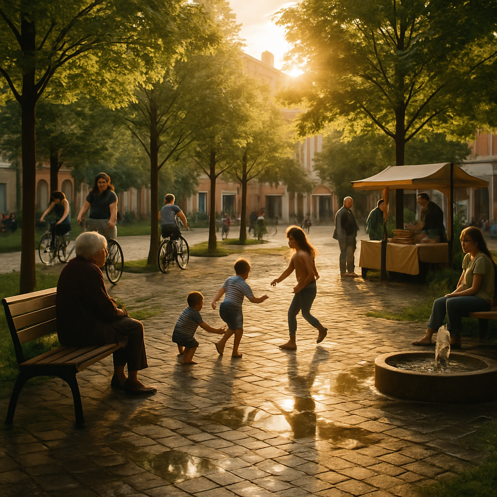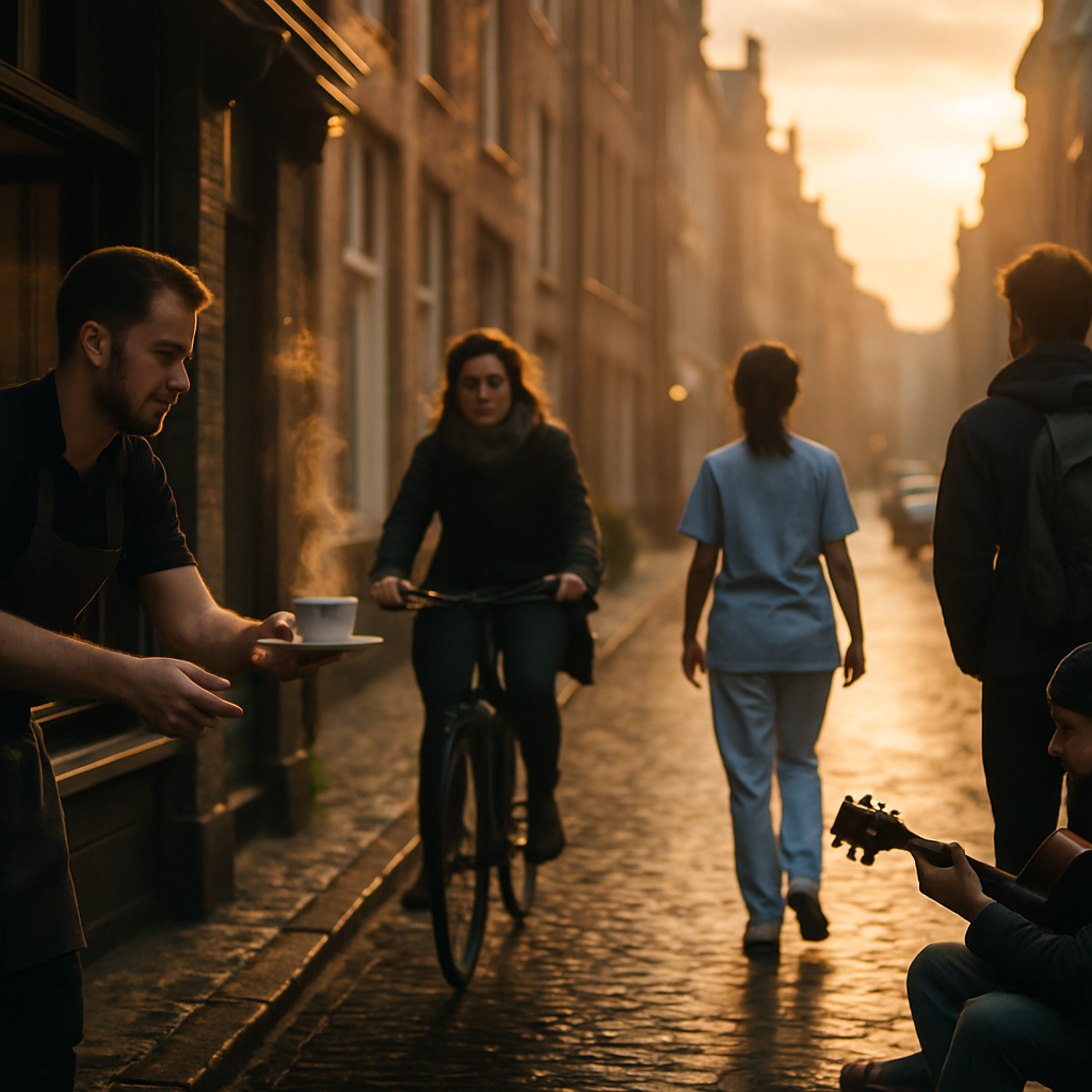 Tussen de stappen en het ruisen van het riet weeft zich een koor van stemmen. Een skater remt zacht naast een stroller; een barista schuift dampende bekers over een betonnen toonbank die aanvoelt als gepolijste riviersteen. Iemand vertelt dat de paden zo zijn gelegd dat iedereen er kan komen — wielen, benen, tempo’s van alle soorten. Een oude man tikt met zijn knokkels tegen het hout en knikt: “Dit blijft.” Een hond schudt water van zijn vacht; druppels fonkelen, kleine sterren in daglicht.